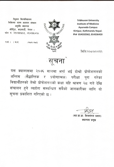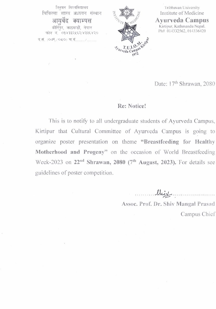 I welcome you to Ayurveda Campus, which was established in 2029 BS(1972 AD) with a vision to uplift ayurveda medical education in Nepal. Since its establishment, this campus is dedicated to deliver high quality education to the students. Bedsides this, it is preaching humanity associated with this noble field. As the campus is growing, we are now running with Post Graduation ( MD Kayachikistiya) and Bachelor Programs (BAMS) course in our Campus. The Campus encourages its faculties to focus on each and every student and encourages them to overcome their shortcomings and appreciating their successes. Thank You !